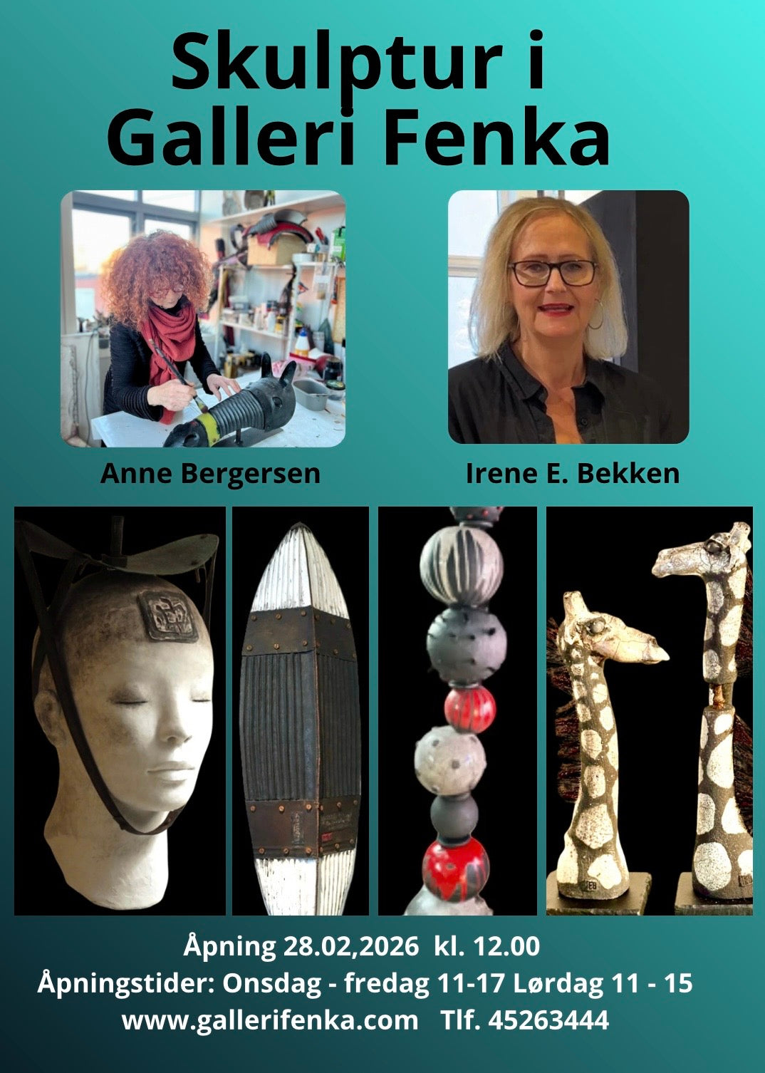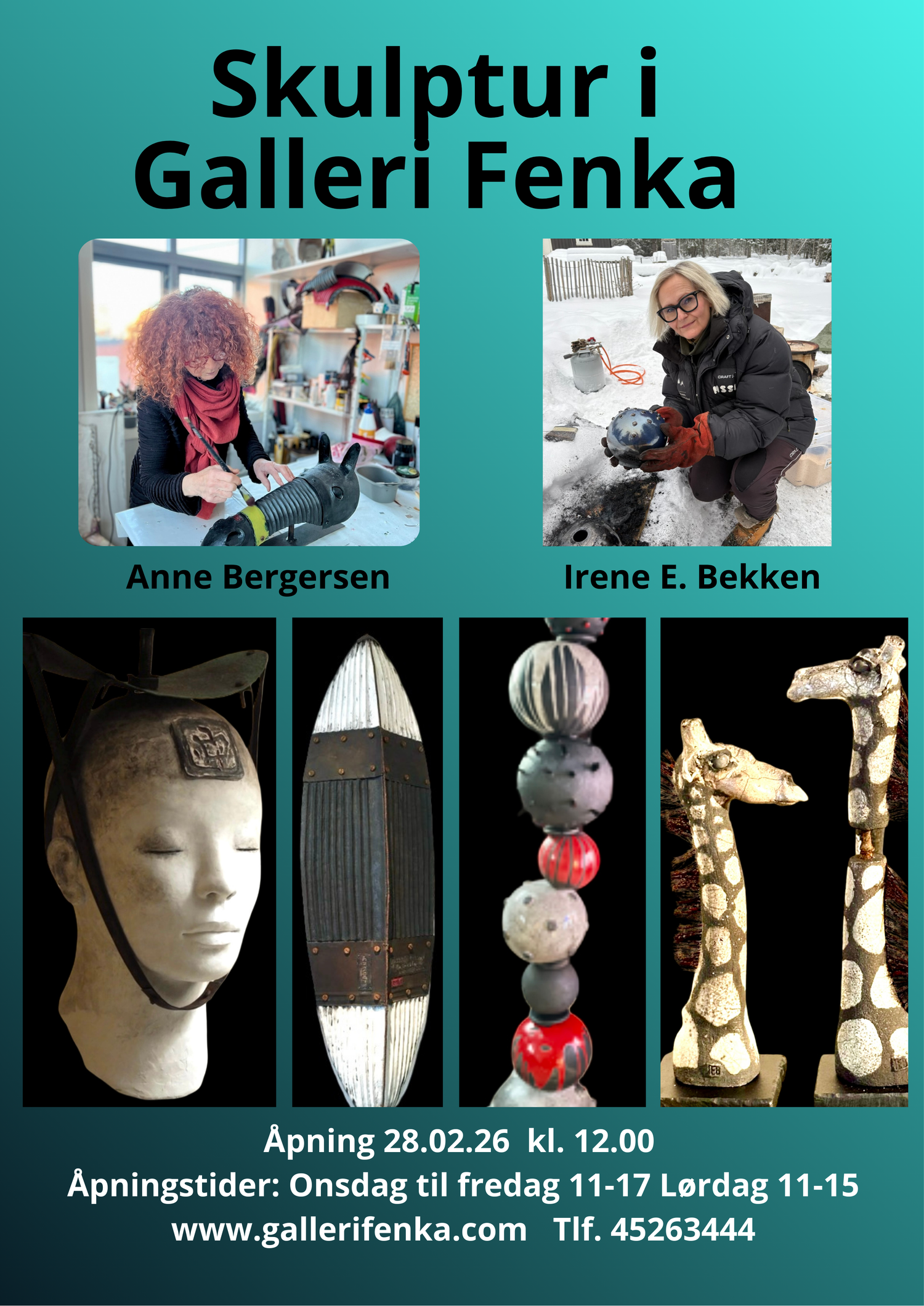 Lørdag 28. februar 2026 kl. 12:00. Utstillingen viser verk av Anne Bergersen og Irene Erikson Bekken.