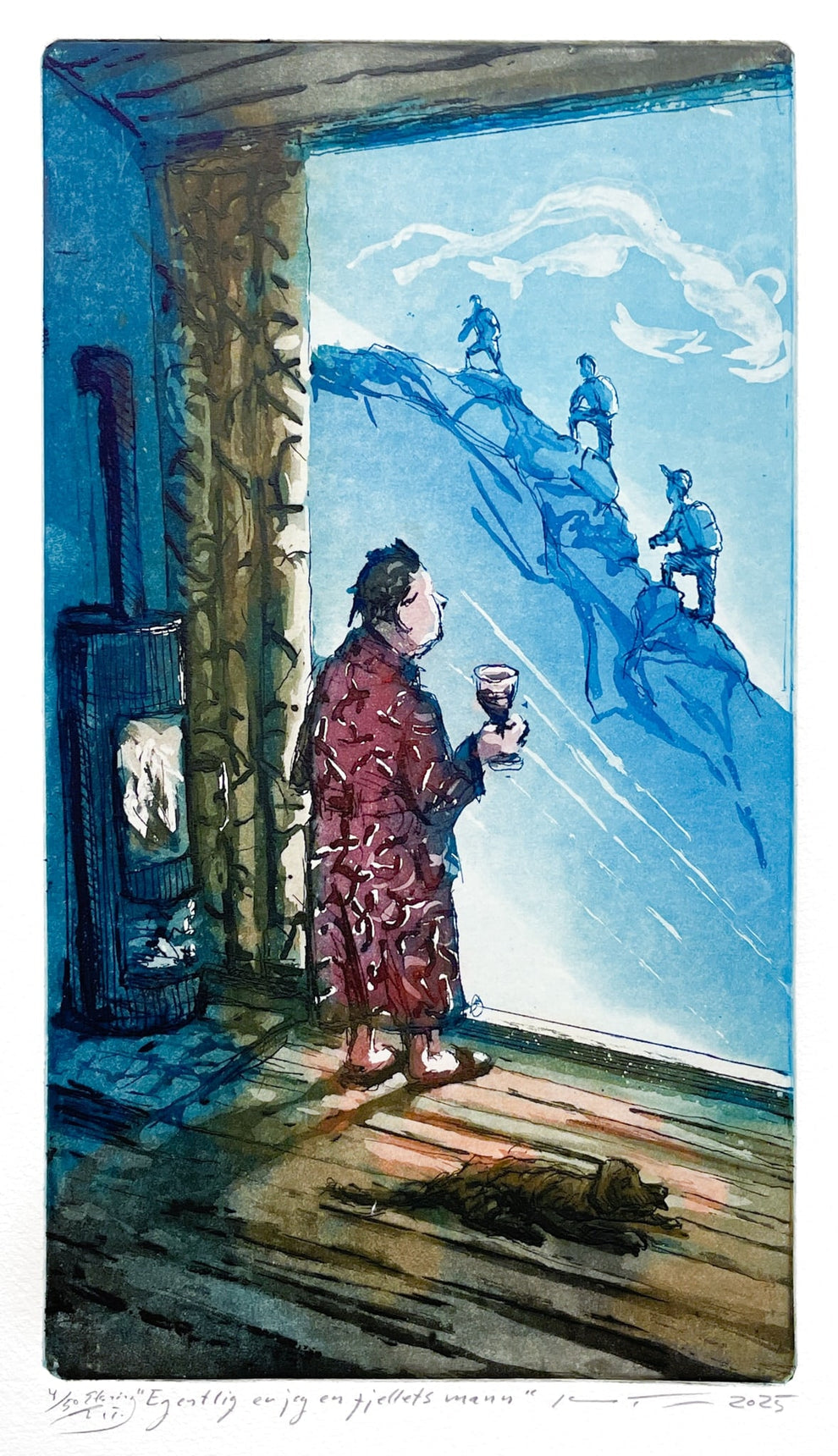 Varme dager på svabergene eller tett snødrev på vidda hvor skiene klabber.Gjennom sine etsninger formidler han menneskers møte med naturen slik at mange kan kjenne seg igjen.