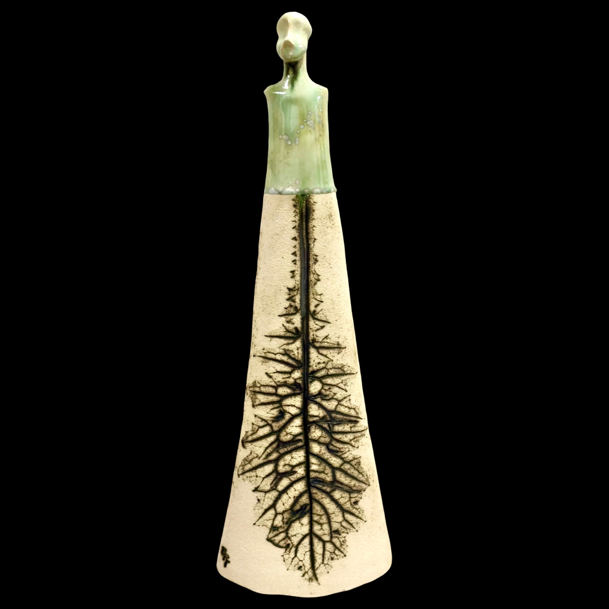 Elin Rødahl Thingnes “Møte med mennesker og naturopplevelser er inspirasjonskilder for meg som keramiker. I arbeidet med leira bruker jeg ofte direkte og sanselige avtrykk av naturen, fysiske minner og gjenstander. Det kan være strå, kornaks, blad fra trær og blomster som uttrykker naturens nerve eller oldemors gamle blondegardiner, et kjolestoff eller en strikkejakke. Når de kjevles inn i leira skaper de unike mønstre som forteller historier gjennom skulpturene jeg skaper med dem. Kombinasjoner av oksyder og glasurer bidrar til røffe og grove kontraster til det lyse og lette. Jeg bruker gjerne leiretyper som inneholder mye sand og struktur i kombinasjon med finere og lettere leiretyper for å skape dialog mellom styrke og sårbarhet. Jeg er født i Kristiansund, men er bosatt i Trondheim.”