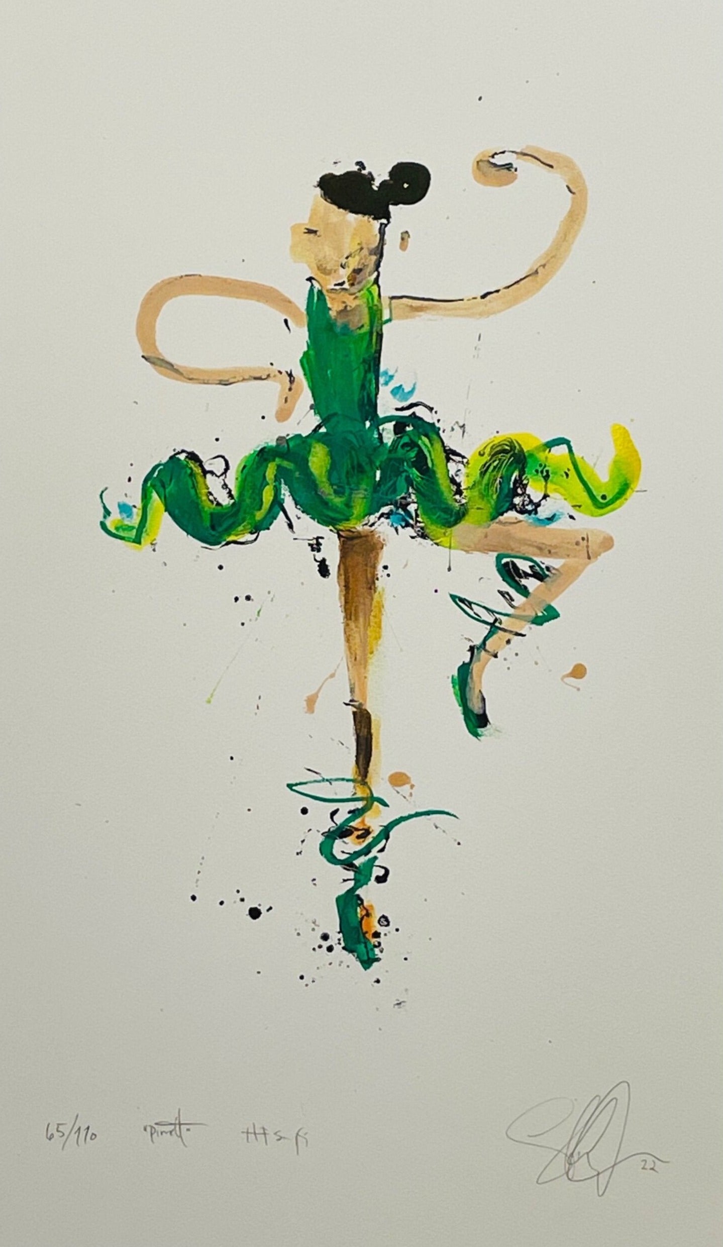 Teknikk Håndkolorert. Alle 110 trykkene er unike. Han har silketrykket en sort bunnfarge som deretter er malt, tegnet og skrevet på.