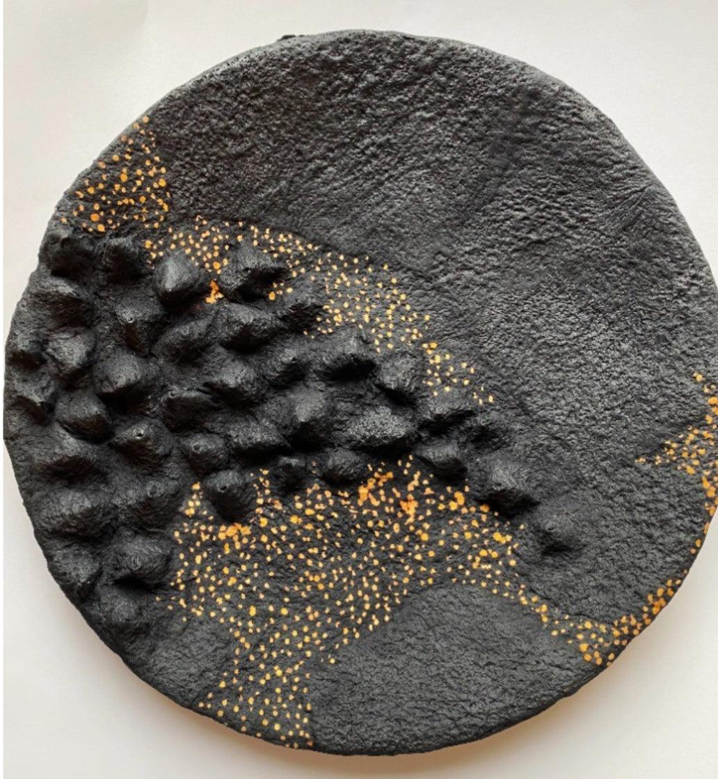Det er laget av et handlaget bomullspapir som jeg har importert fra India. Papiret kalles Moonrock etter tørkemetoden. Først males/moses bomullsfibrene i en stor maskin, dette tømmes så i et stort kar med vann slik at fibrene flyter fritt og jevnt i vannet., Der brukes en stor ramme med netting som føres ned i karet og fanger opp et lag med fibre. Dette blir begynnelsen på et stort papirark. For å tørke arket så legges dette på en spesiell stein slik at arket får en spesiell overflate; - som en månestein (Moonroc)